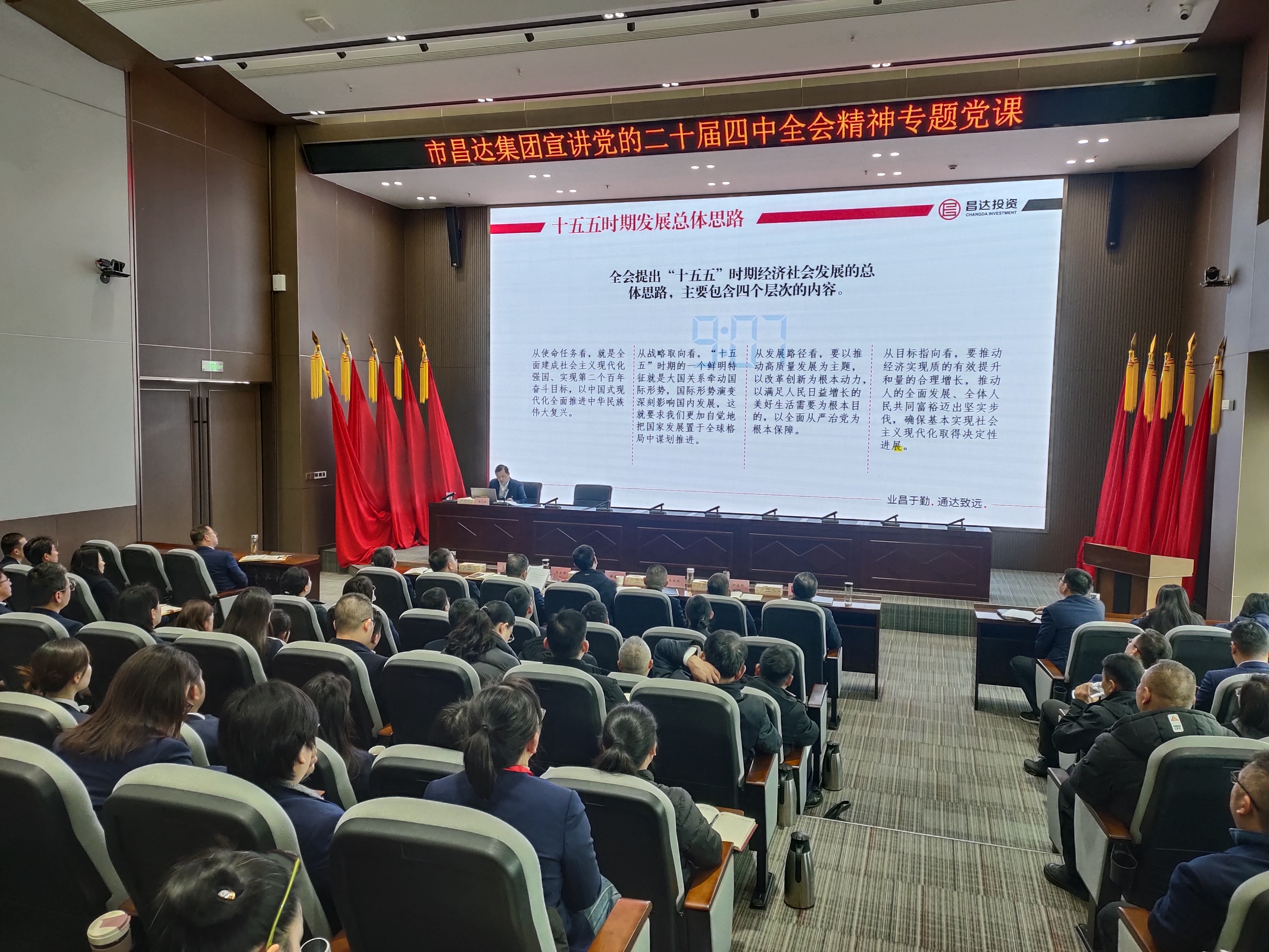 12月30日,市昌达集团开展党的二十届四中全会精神专题党课宣讲。集团党委书记、董事长金先波讲授专题党课。集团领导班子成员、各子公司副部长级以上人员、集团总部全体员工及集团公司全体党员参加。