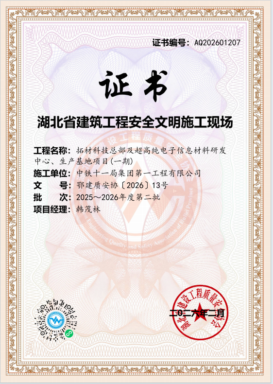 近日,从湖北省建设工程质量安全协会传来重磅捷报,鄂州市昌达投资控股集团有限公司旗下昌拓公司投资建设的拓材科技总部及超高纯电子信息材料研发中心、生产基地项目(一期)实力出圈,一举斩获2024~2025 年度第四批湖北省建筑结构优质工程、2025~2026 年度第二批湖北省建筑工程安全文明施工现场两项省级殊荣,其中建筑结构优质工程奖项为鄂州唯一获评项目,成为省内工程建设领域质量与安全管理的标杆,此次获奖是湖北省建设工程质量安全协会对项目工程结构质量、安全文明施工管理水平的高度认可,更是市昌达集团坚守品质为先、安全为本建设理念的生动实践,彰显了集团在项目建设领域的硬核实力与匠心追求。